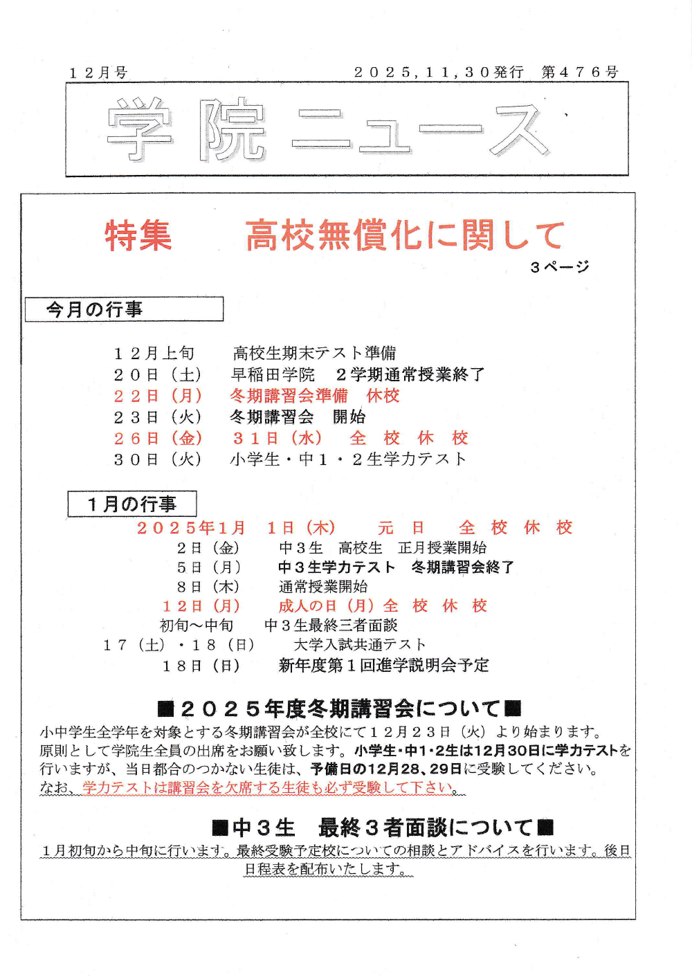 2025年12月1日 / 最終更新日時 : 2025年12月1日 dos 新着情報 学院ニュース12月号 早稲田学院の学院ニュース12月号です。学院ニュースは毎月末に次月分を発行しております。 早稲田学院の最新情報がつまっておりますので、どうぞご一読ください。 (上の画像をクリックすると、PDFデータが開きます)